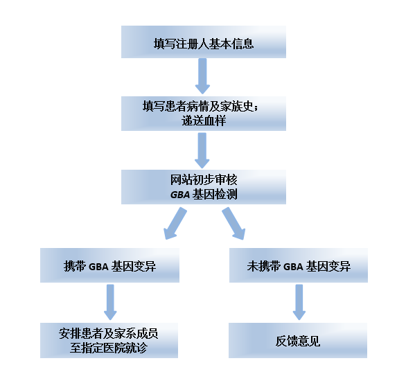 如果您或您的亲属符合上述特点,并已知具有GBA基因变异就可以注册中国伴GBA变异帕金森病注册登记网;若您不明确自己或亲属是否具有GBA基因变异,可先提交10mL静脉血样至指定机构行GBA基因检测。网站的专业医生在审核您提交的患者临床资料和遗传学资料,将就您是否诊断为帕金森病及是否具有GBA变异给予回复。如果您或您的亲属确实具有GBA变异并诊断为帕金森病,我们将电话联系您,告知下步您或您的家人可能需要完善的临床检查,并为您和您的家人提供专业的诊疗意见,遗传咨询和干预计划。网络登记有严格的隐私保护政策,以保护注册人、患者和患者家庭成员的个人信息。