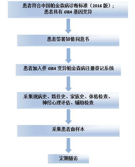 PD患者经中南大学湘雅医院或指定医院专家确诊,并行GBA基因检测明确具有GBA基因变异后,可加入中国伴GBA变异帕金森病注册登记研究,进行详细的临床评估、辅助检查、定期随访。具体内容如下: