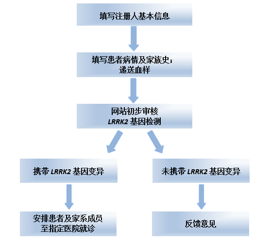 如果您或您的亲属符合上述特点,并已知具有LRRK2基因变异就可以注册中国伴LRRK2变异帕金森病注册登记网;若您不明确自己或亲属是否具有LRRK2基因变异,可先提交10mL静脉血样至指定机构行LRRK2基因检测。网站的专业医生在审核您提交的患者临床资料和遗传学资料,将就您是否诊断为帕金森病及是否具有LRRK2变异给予回复。如果您或您的亲属确实具有LRRK2变异并诊断为帕金森病,我们将电话联系您,告知下步您或您的家人可能需要完善的临床检查,并为您和您的家人提供专业的诊疗意见,遗传咨询和干预计划。网络登记有严格的隐私保护政策,以保护注册人、患者和患者家庭成员的个人信息。
