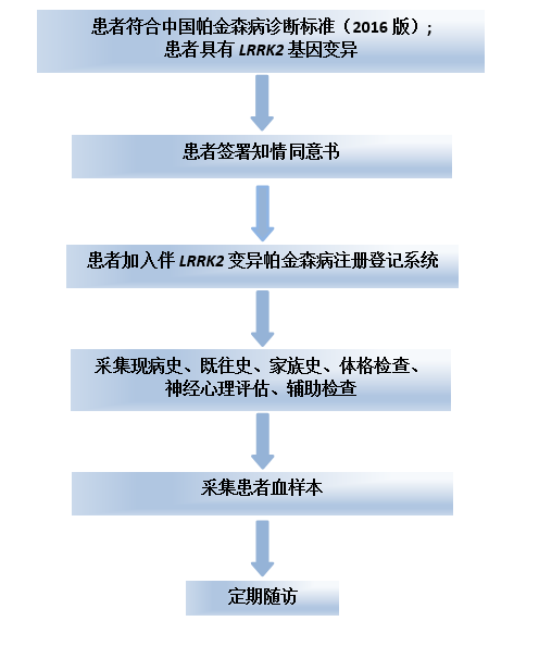 PD患者经中南大学湘雅医院或指定医院专家确诊,并行LRRK2基因检测明确具有LRRK2基因变异后,可加入中国伴LRRK2变异帕金森病注册登记研究,进行详细的临床评估、辅助检查、定期随访。具体内容如下: